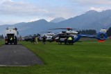 Für die Durchführung des Lehrgangs musste das Segefluggelände in Füssen vorübergehend mit notwendigen Extras ausgestattet werden. Dazu zählte ein mobiler Tower mit Sendemast für das kontrollierte Befliegen des Bereiches der Einflugschneise. In kleinen Gruppen von vier oder fünf Maschinen, mit wenigen Sekunden Abstand, füllt sich schnell das Gelände. Kaum am Boden werden die Hubschrauber neu betankt. Mit zwei Tanklastwägen wird dies zügig und mit viel Routine abgewickelt. Dieser sensible Vorgang des Tankens sichert ein Fahrzeug der Bundespolizei-Feuerwehr ab.